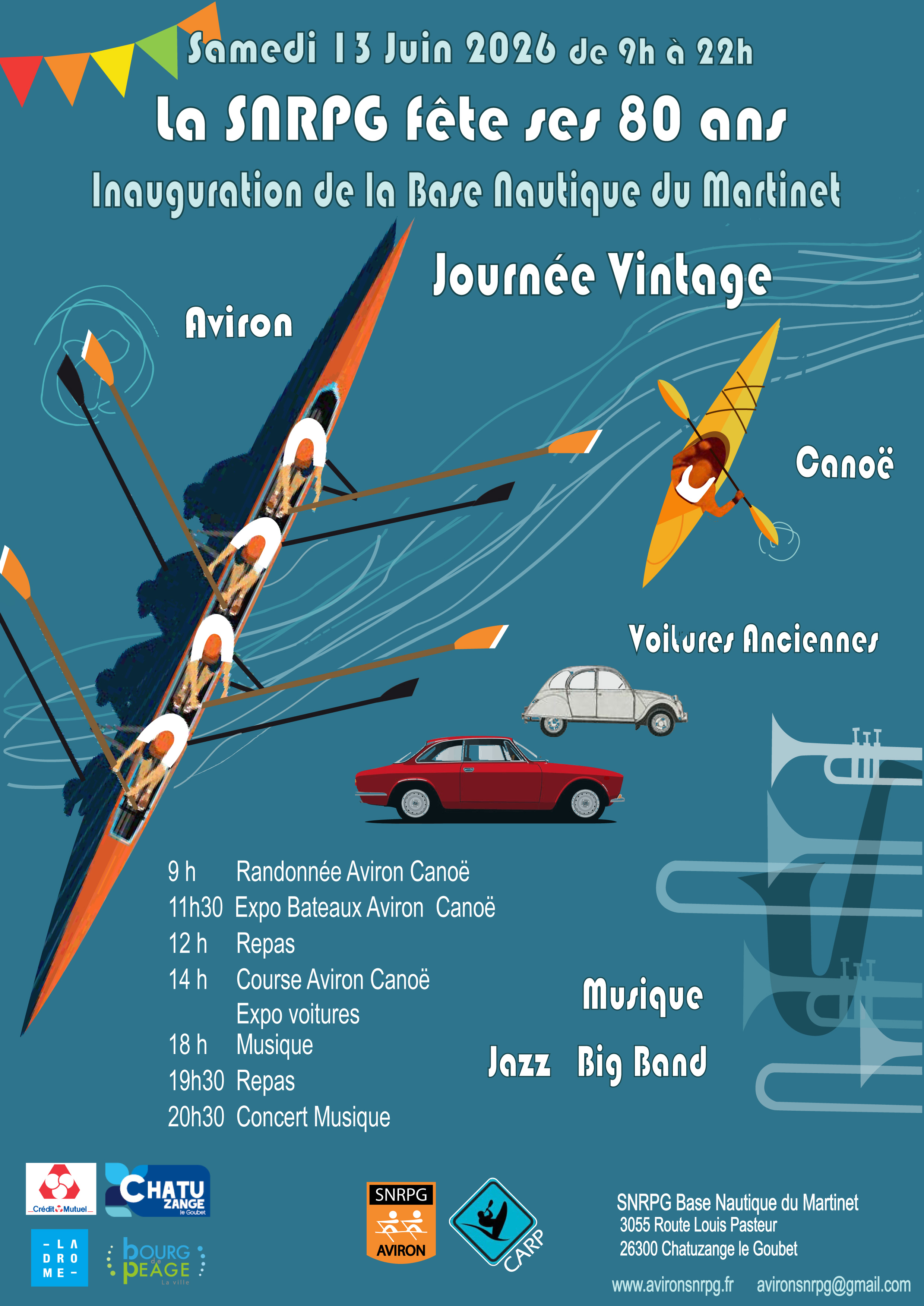 13 juin 2026 La Journée Vintage pour les 80 ans de la Société Nautique Romanaise, Péagoise et Goubetoise (SNRPG), et l'inauguration de la base nautique Aviron Canoë. Fiche d'inscription |